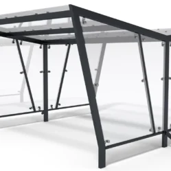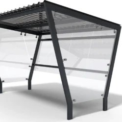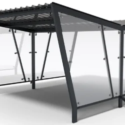 Die Überdachung besteht aus hochwertigen, transparenten Stegplatten, die optimalen Wetterschutz bei gleichzeitig heller Wirkung gewährleisten. Dank der charakteristischen Form fügt sich PirCa Glide ideal in moderne Außenbereiche ein – von Schulhöfen über städtische Grünanlagen bis zu Mitarbeiterparkplätzen. Optional in Wunschfarbe lackierbar, für Betonfundament oder Fußmontage vorbereitet.