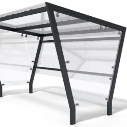 Die edelste Form des Fahrradunterstands: PirCa Frame kombiniert Stahl mit Glas oder Trapezblech und ist in zwei Dachvarianten erhältlich: